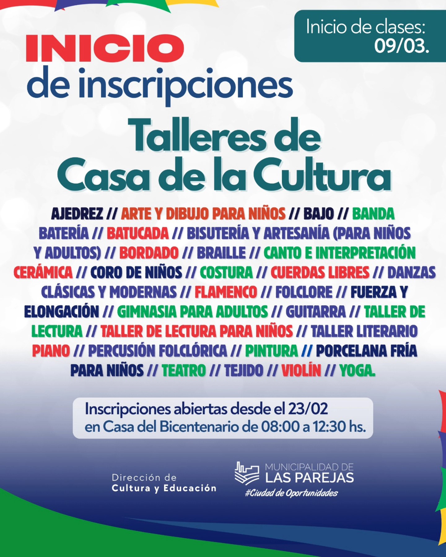 Continuar LeyendoUna propuesta para niñas, niños, jóvenes y adultos, con espacios de arte, música, danza, lectura y movimiento. Desde el 23/02 Casa del Bicentenario de 08:00 a 12:30 hs. Inicio de clases: 09/03 Sumate, aprendé y compartí. ¡Te esperamos!