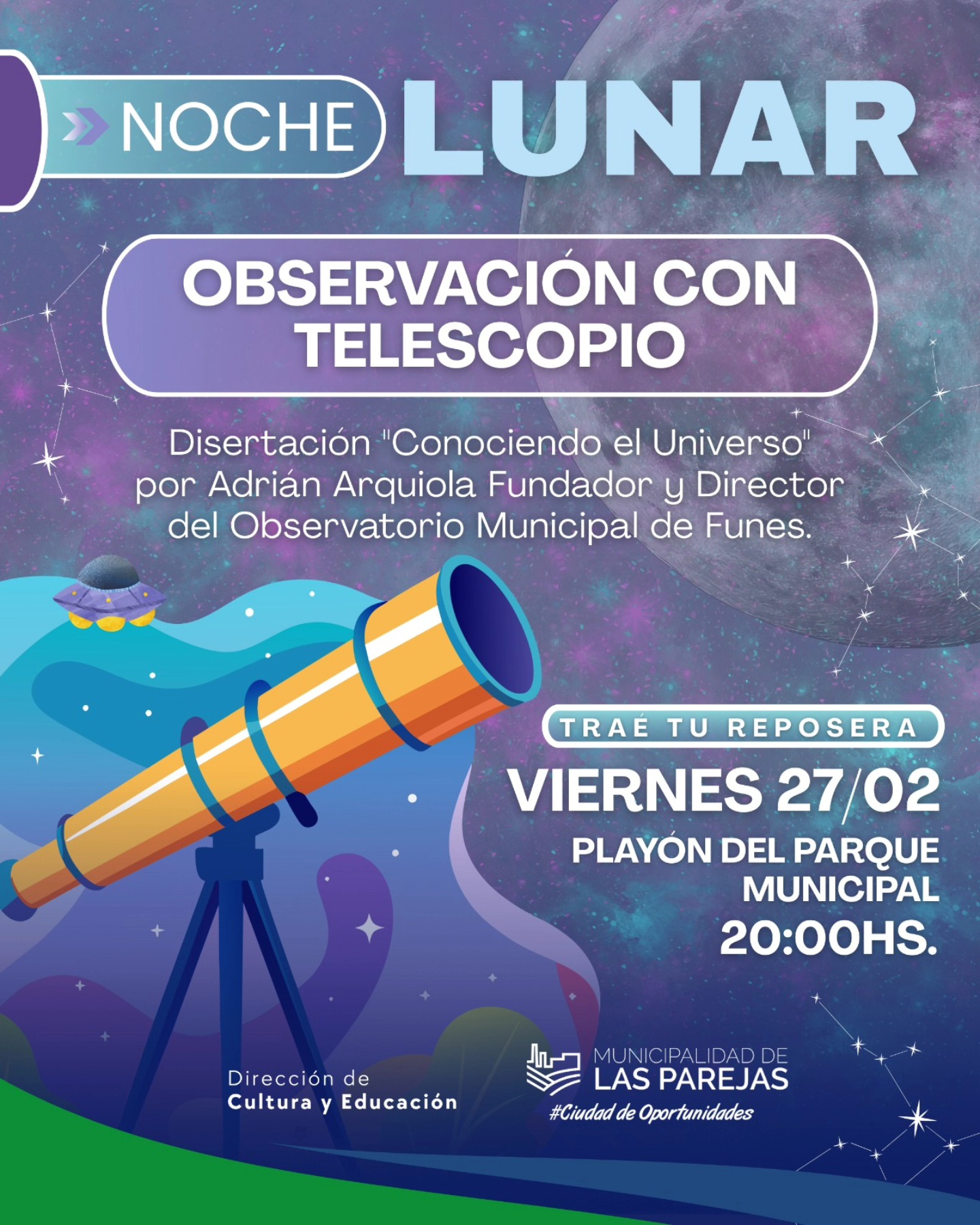 Continuar LeyendoTe invitamos a vivir una experiencia única bajo el cielo: una noche de observación con telescopio, para descubrir la Luna y el Universo de una manera cercana y fascinante. Traé tu reposera, compartí una noche distinta y dejate sorprender por la inmensidad del cosmos. Playón del Parque Municipal Viernes 27 de febrero 20:00 hs Actividad libre y gratuita, organizada por la Dirección de Cultura y Educación de la Municipalidad de Las Parejas. ¡Te esperamos para mirar el cielo juntos