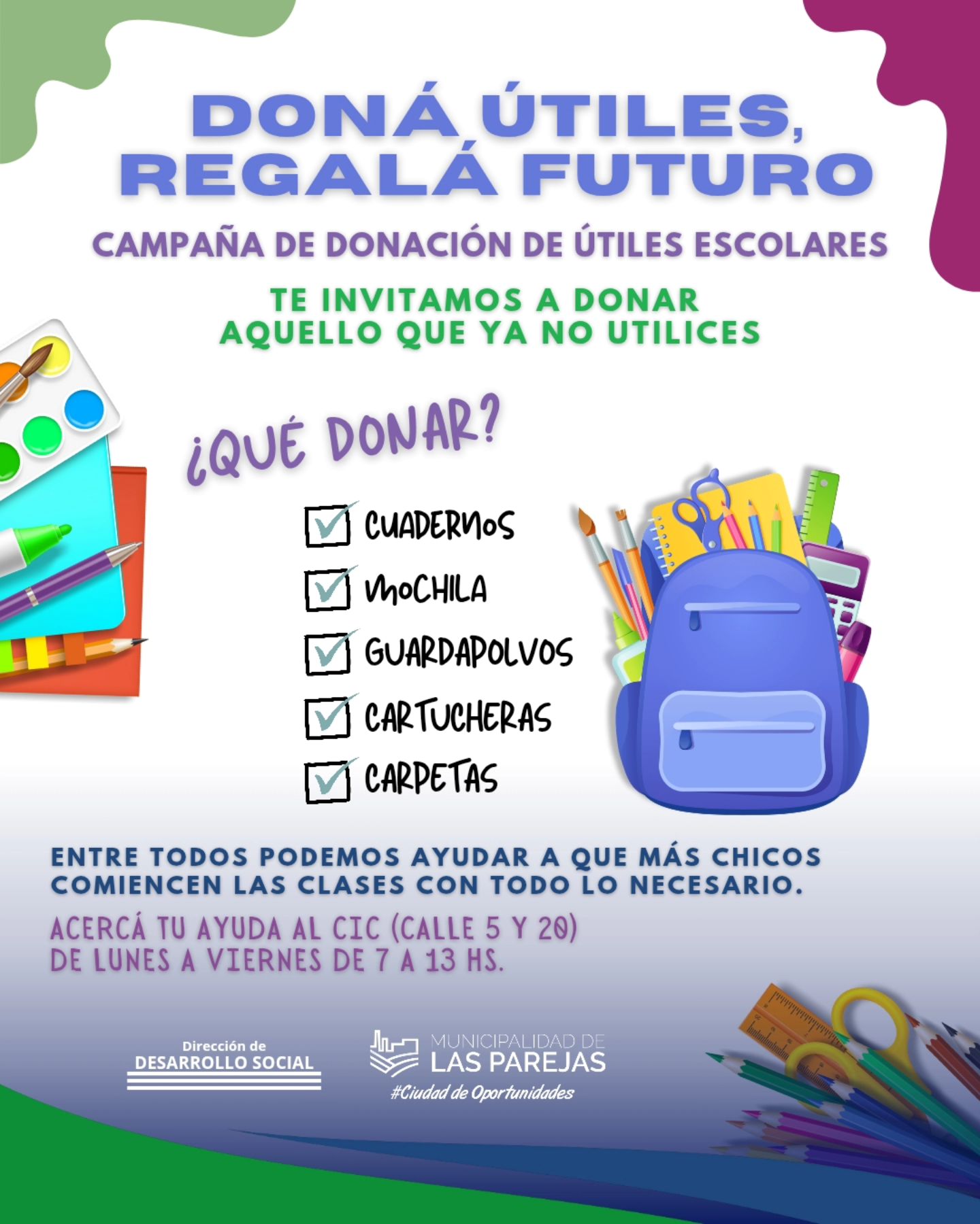 Comienzan las clases en Las Parejas. Sumate a la campaña Doná útiles, regalá futuro Si tenés útiles en buen estado que ya no usás, acercalos al CIC (lunes a viernes de 7 a 13 hs). Entre todos podemos ayudar a que más chicos y chicas empiecen el año con todo lo necesario Tu donación hace la diferencia
